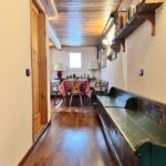 L’ingresso si apre su un ampio soggiorno, vero cuore della casa, caratterizzato da finiture in legno che creano un’atmosfera calda e accogliente. Qui troviamo la zona pranzo e un cucinino compatto ma perfettamente funzionale, studiato per ottimizzare ogni spazio.